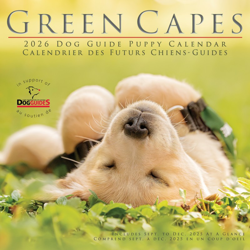 This gorgeous calendar is filled with pictures of Future Superheros. Every pup is a proud owner of a green Lions Foundation of Canada Future Dog Guide jacket (a "green cape").